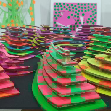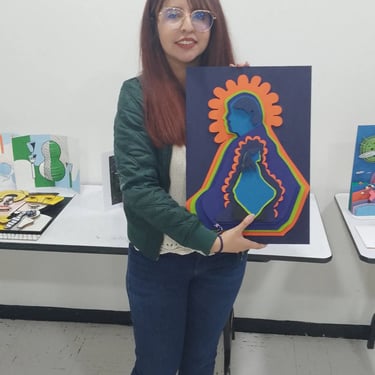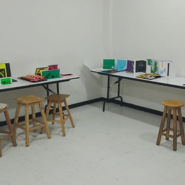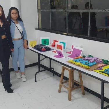 Primer semestre: cartel 3d tamaño tabloide en planos superpuestos, una pieza en planos seriados y una pieza en kirigami basados en la obra de un diseñador gráfico colombiano.